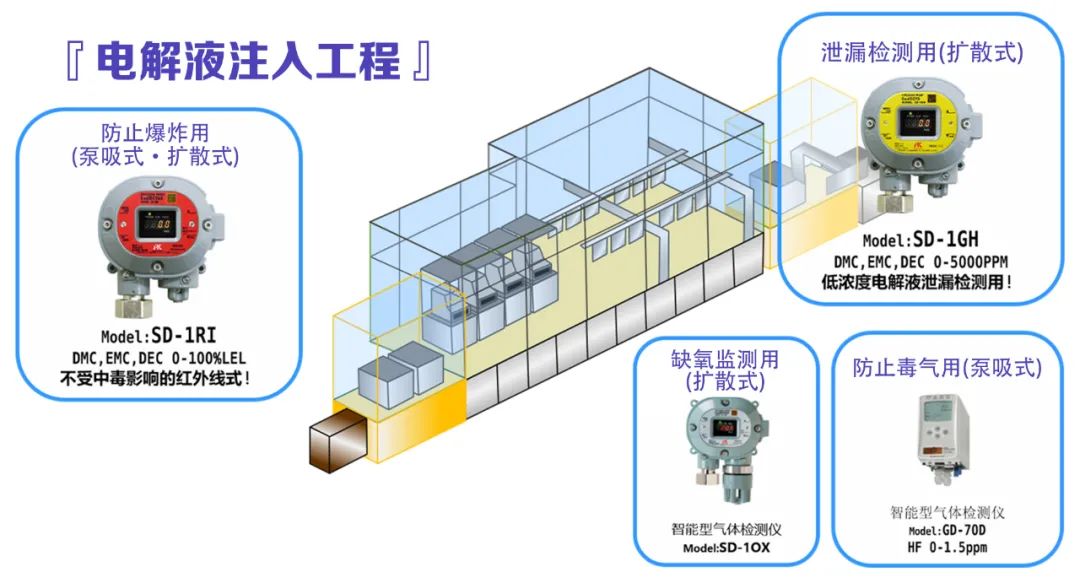 在此環(huán)境下,理研計器通過SD-1系列以及GD-70D的安裝搭配,可以檢測低濃度(ppm)氣體的泄漏情況,保障這一道電解液注入工序的安全↓↓↓