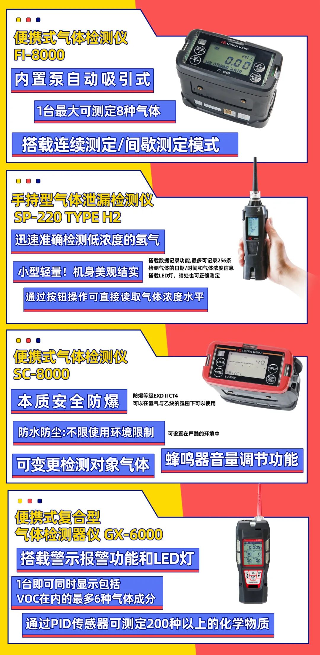● SC-8000、FI-8000、SP-220、GX-6000 便攜式氣體檢測(cè)儀,可用于工業(yè)生產(chǎn)環(huán)境下的氣體巡查、測(cè)漏等,防患于未然。